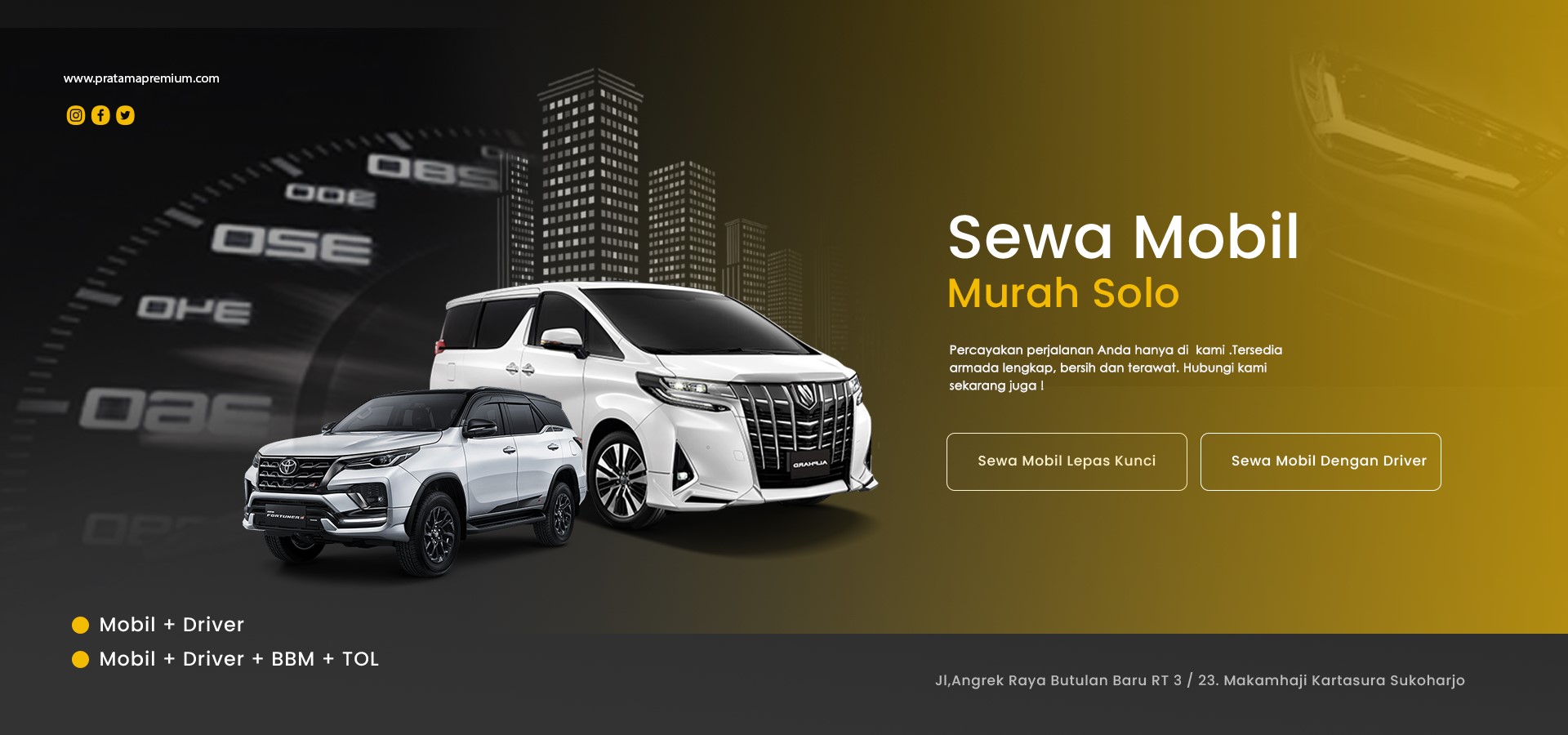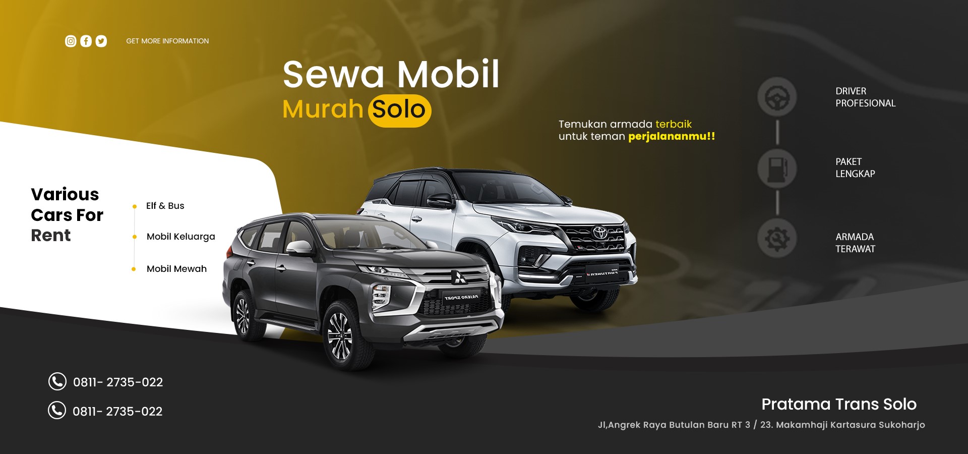 Kami Pratama Rentcar Solo adalah rental mobil berbasis di kota Solo yang sangat berpengalaman di wilayah Solo, Jogjakarta, Semarang dan sekitarnya. Pratama Rentcar Solo sudah sangat berpengalaman dalam melayani acara event dokter, event perbankan, event pemerintahan, wisata keluarga baik lokal maupun nasional. Dengan pelayanan yang sangat profesional, driver yang handal, ramah, sopan, sabar, dan rapi, serta Armada yang selalu bersih dan wangi, dengan harga yang murah dan terjangkau kami sangat mengutamakan keselamatan, kenyamanan serta kepercayaan customer.